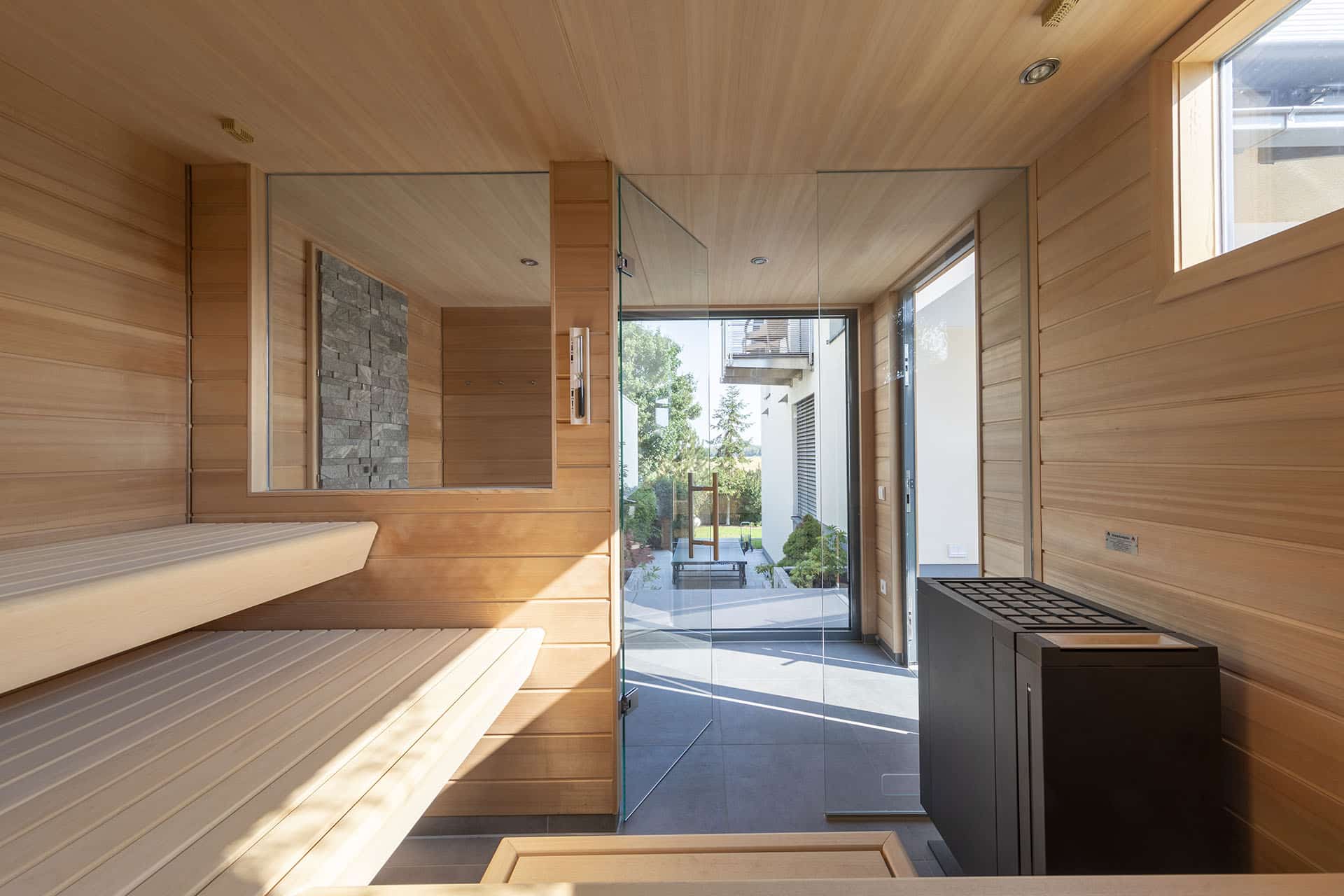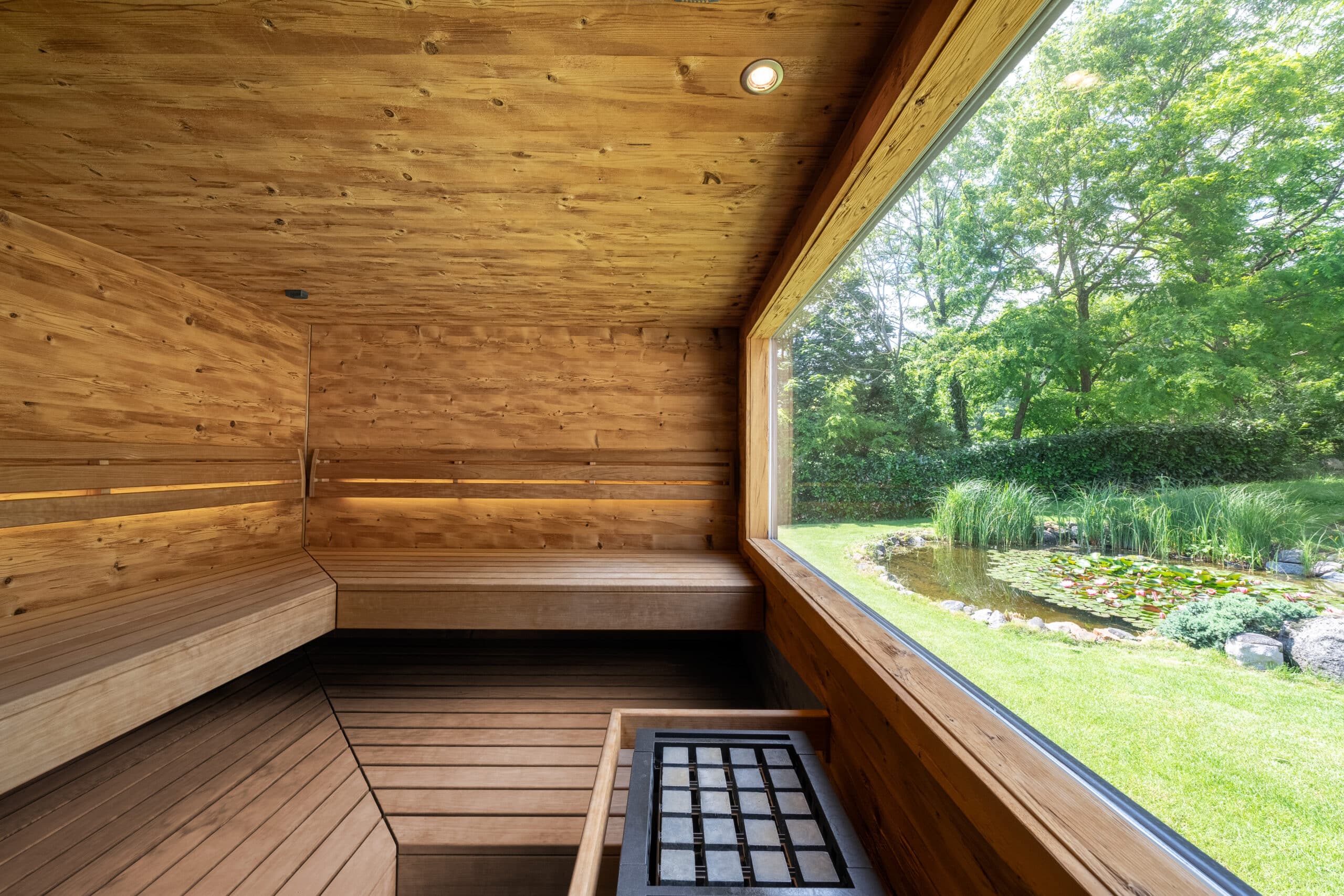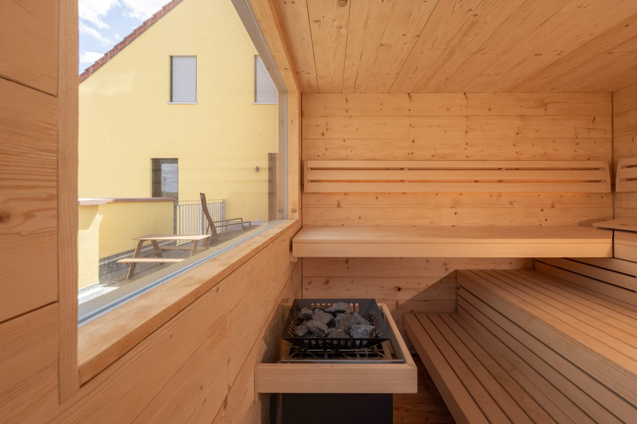 Der Wunsch „im Freien“ zu saunieren stand bei diesem Projekt an erster Stelle. Das Wechselspiel von körperlicher Anstrengung beim Schwimmen und Ruhephasen in der Sauna sorgt in der schnelllebigen Zeit für den nötigen Ausgleich. Die Außenverkleidung wurde mit wetterfesten Fassadenplatten zeitlos gestaltet. Bei der Innenverkleidung entschieden sich die Kunden für ein edles Doppelnutprofil der kanadischen Hemlock Tanne. Die Liegeneinrichtung auf Gehrung gearbeitet sowie die außergewöhnliche Liegenhalterung vor dem großen Panoramafenster zeigen den hohen Anspruch des Projektes.