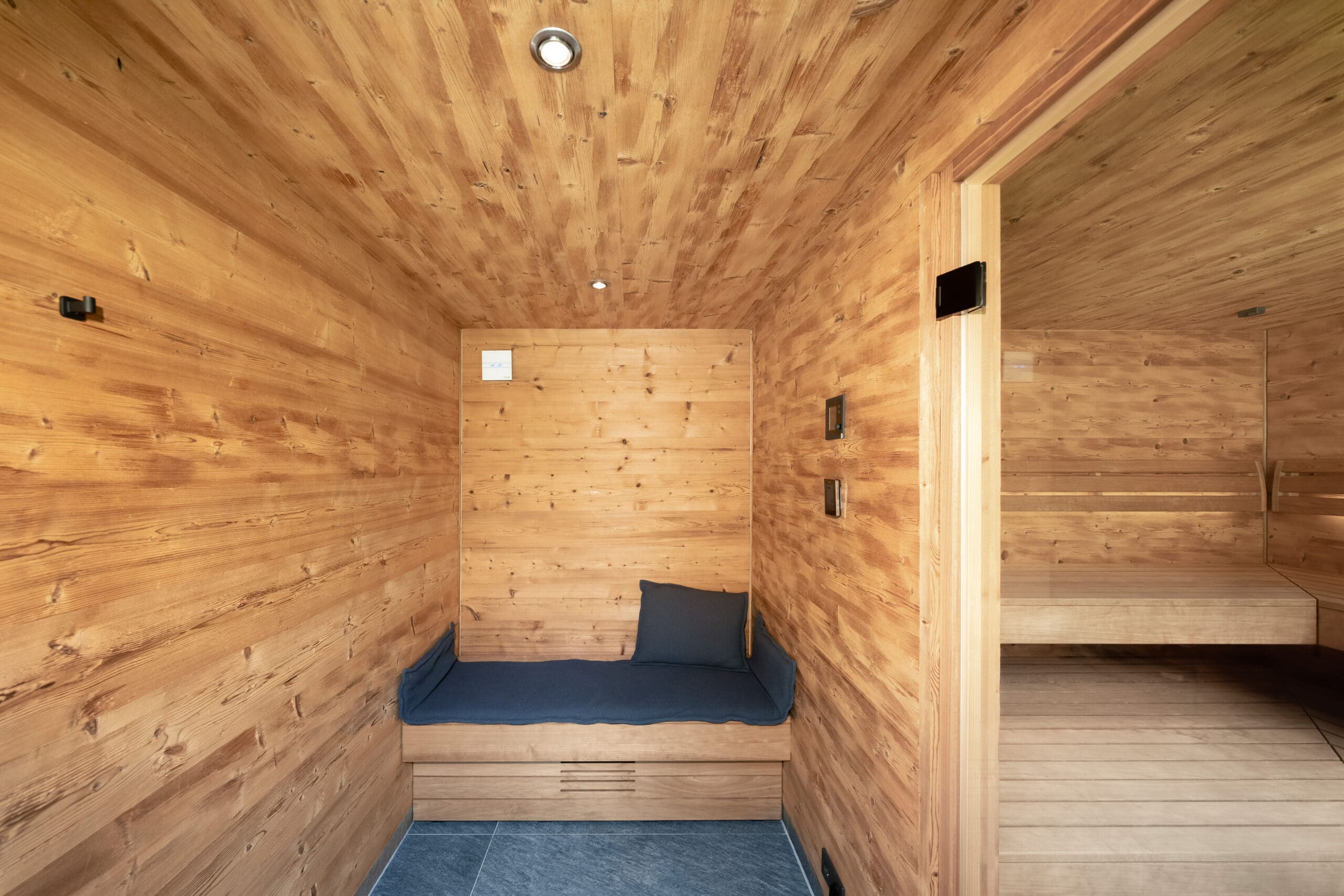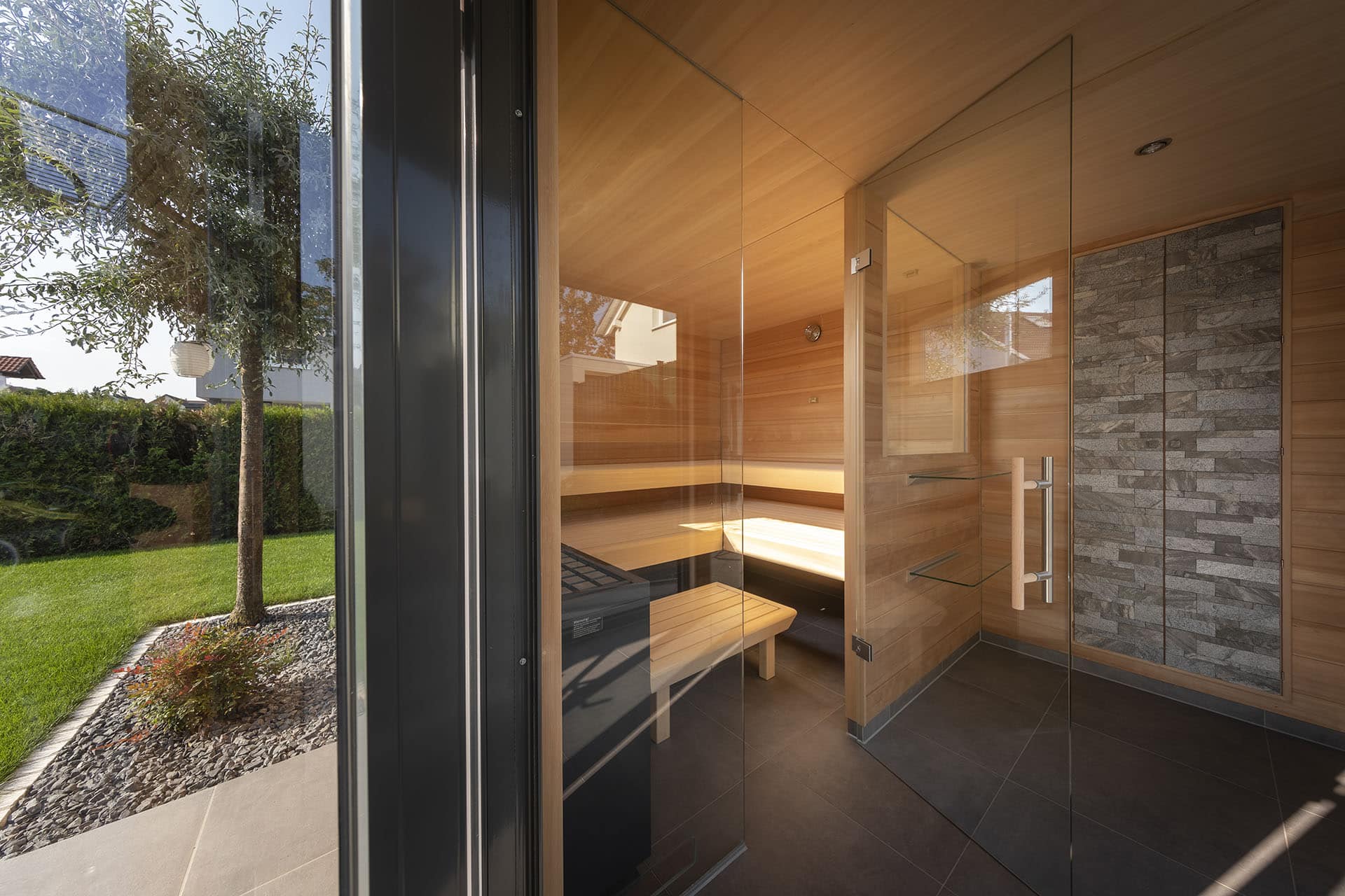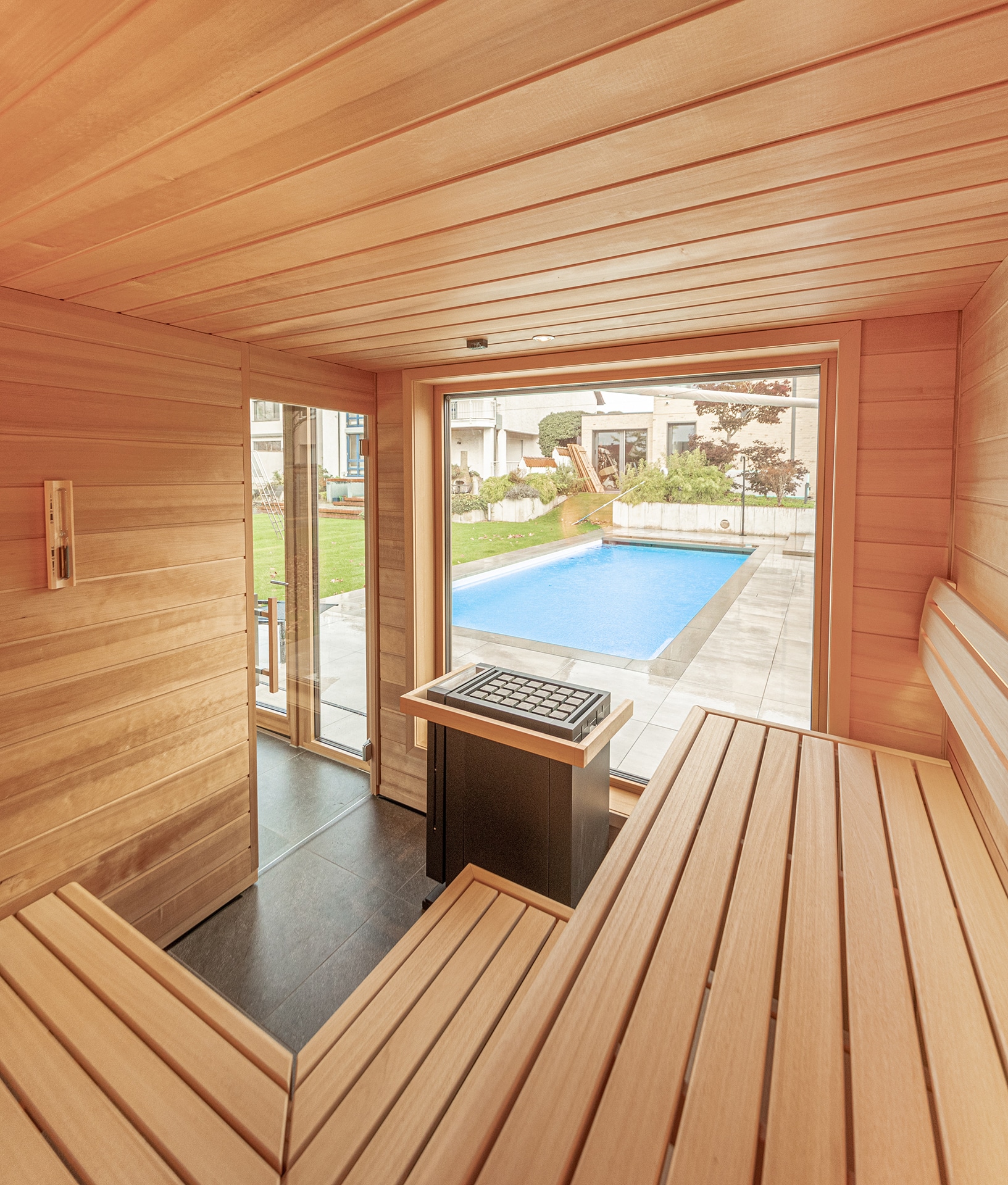 Der Wunsch „im Freien“ zu saunieren stand bei diesem Projekt an erster Stelle. Das Wechselspiel von körperlicher Anstrengung beim Schwimmen und Ruhephasen in der Sauna sorgt in der schnelllebigen Zeit für den nötigen Ausgleich. Die Außenverkleidung wurde mit wetterfesten Fassadenplatten zeitlos gestaltet. Bei der Innenverkleidung entschieden sich die Kunden für ein edles Doppelnutprofil der kanadischen Hemlock Tanne. Die Liegeneinrichtung auf Gehrung gearbeitet sowie die außergewöhnliche Liegenhalterung vor dem großen Panoramafenster zeigen den hohen Anspruch des Projektes.