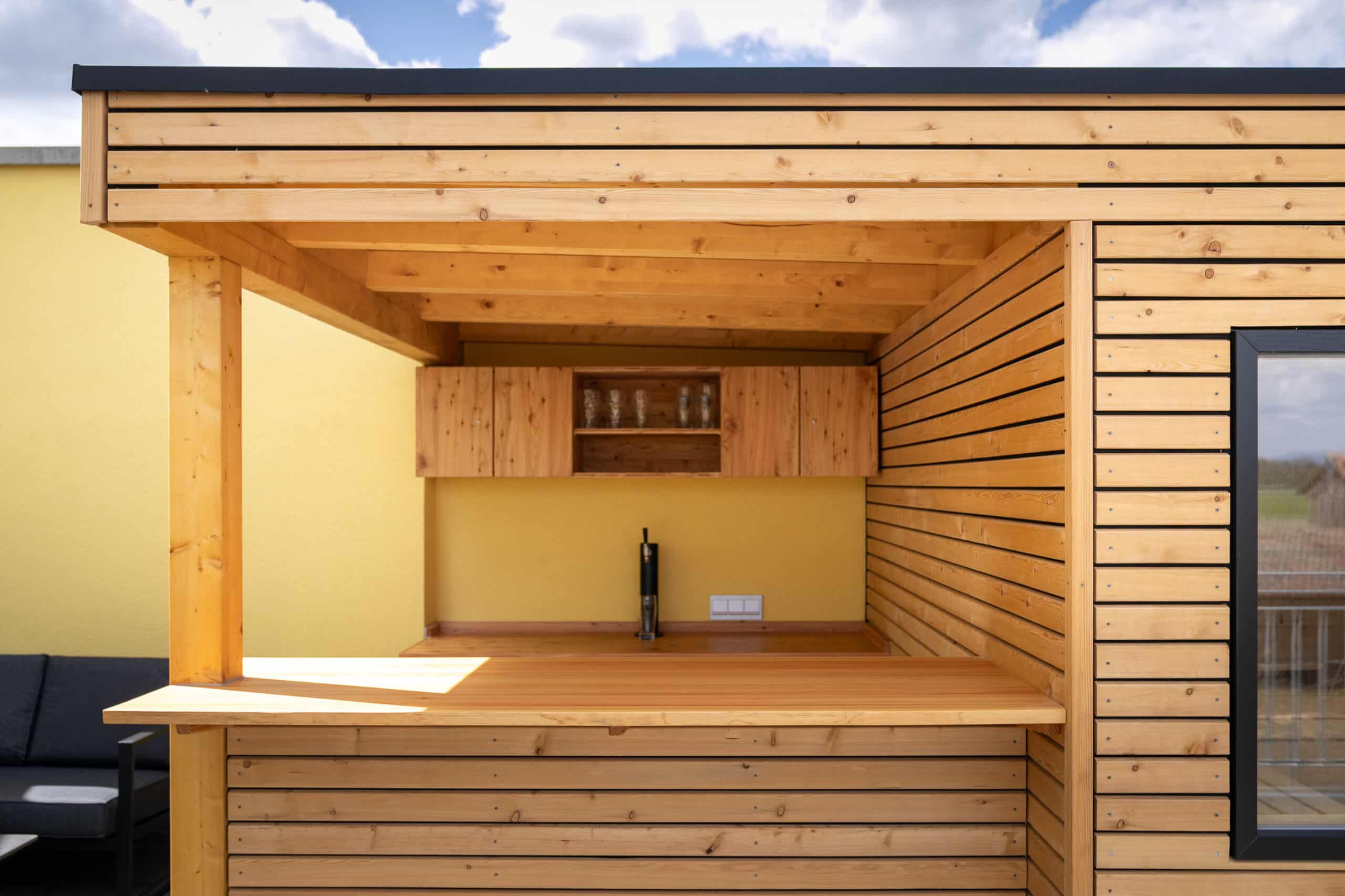 Im Zuge eines Hausneubaus wurde der Saunabereich bewusst auf der Dachterrasse geplant. Neben der Sauna mit unverbaubarem Blick auf Wald und Wiesen, sollte auch ein überdachter Barbereich mit massiver Theke und Zapfanlage realisiert werden. Für zusätzlichen Stauraum haben wir durch die Schrankwand in Lärchenholz gesorgt. Diese ist nicht nur für Gläser und andere Utensilien gedacht, sondern auch für die Saunatechnik und das entsprechende Zubehör. Bei der Verkleidung der Außenseiten entschieden sich die Bauherren für die zu dem Schrank und Barbereich gut harmonierende Rhombusleisten-Optik, selbstverständlich auch aus Lärchenholz. Der Innenbereich der Sauna wurde wiederum mit einer gehackten und gebürsteten Fichtenverkleidung eher rustikal gehalten. Die Rückenlehnenbeleuchtung lässt, vor allem in den Abendstunden, ein wohliges Gefühl entstehen und setzt die Oberfläche des Holzes nochmals ganz anders in Szene. Der Blick durch das große Panoramafenster mit anschließendem abkühlen an der Außendusche und entspannen auf der Sitzlounge, lassen das Saunieren zu etwas ganz Besonderem werden.