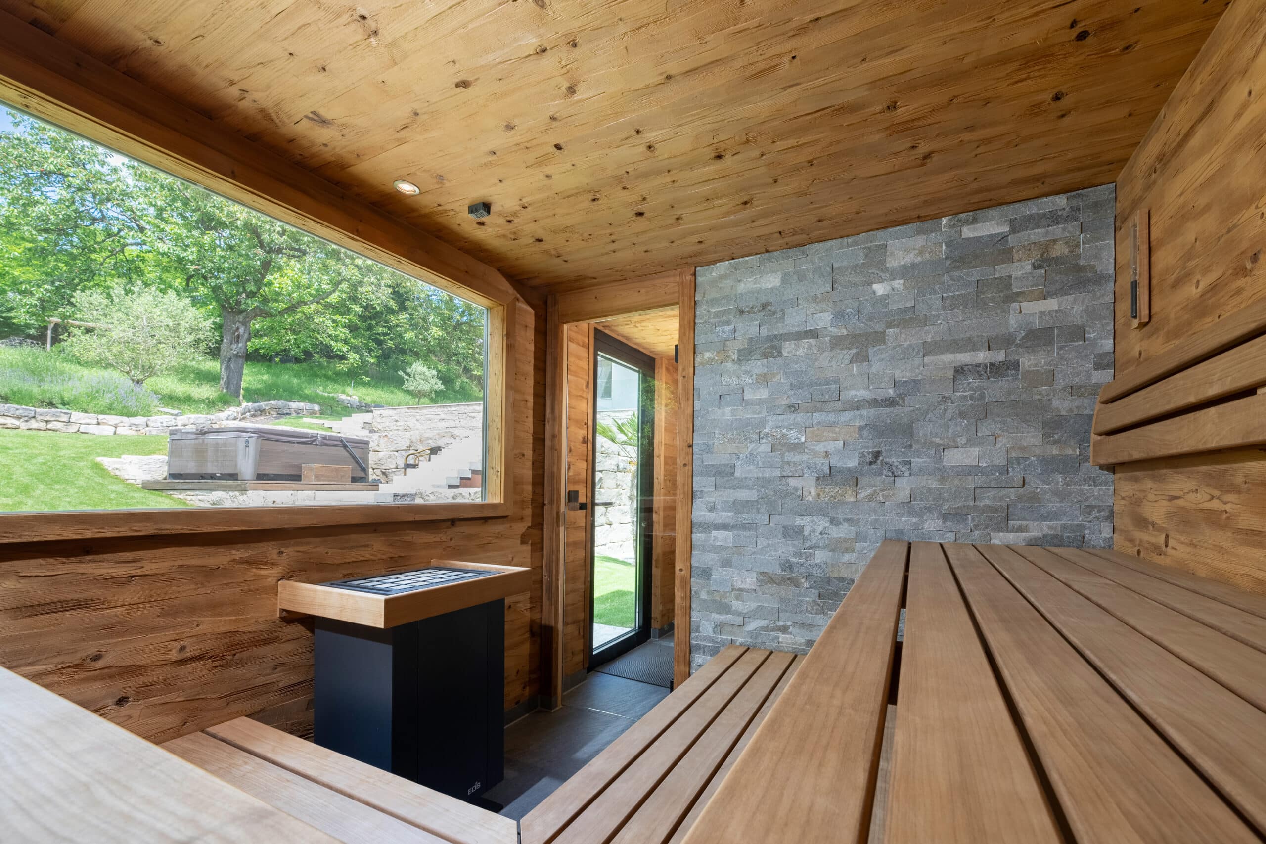 Den großen Wunsch mit Blick in den Wald und den eigenen Garten konnten wir bei diesem Projekt den Bauherren erfüllen. Im großzügig neu angelegten Garten ist die Jockers-Außensauna ein absolutes Highlight. Die Außenverkleidung wurde mit wetterfesten Fassadenplatten, in Steinoptik, gestaltet. Bei der Innenverkleidung entschieden sich die Kunden für ein rustikales breites Thermoholz in gehackt und gebürsteter Oberfläche. Die Technik konnte man unter dem Sitzbereich im Vorraum elegant verstecken. Nach dem erholenden Saunagang kann man sich im neu angelegten Natur- Schwimmteich abkühlen oder im Whirlpool weiter entspannen. Mit diesem einmaligen Blick in die Natur kann man hier den stressigen Alltag hinter sich lassen und die Jockers-Außensauna in vollen Zügen genießen.