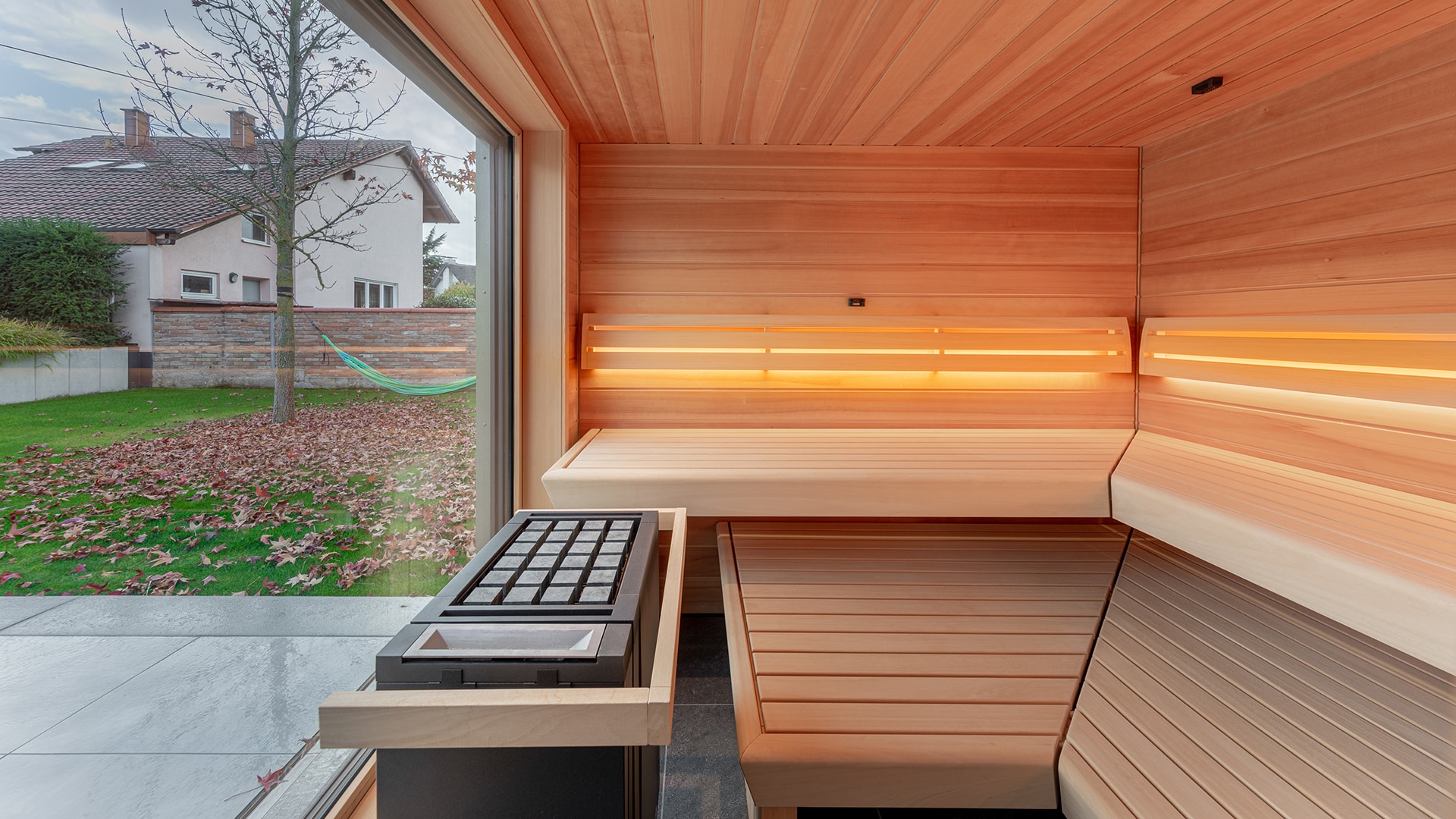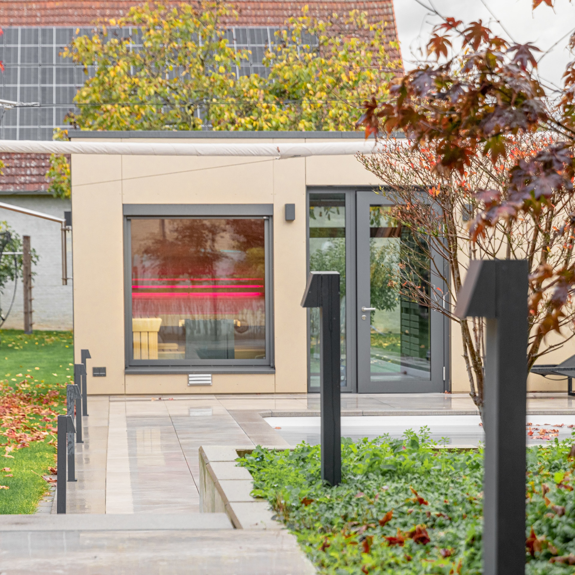 Die Hausbesitzer wollten den Garten nach dem Hauskauf komplett neugestalten. Die Außensauna sollte hierbei komplett im Fokus stehen. In Zusammenarbeit, mit einem von uns empfohlenen Garten – und Landschaftsbauer, haben wir die Gartenplanung übernommen und gemeinsam mit dem Kunden alle Wünsche einfließen lassen. Bei der Verkleidung der Außenseiten entschieden sich die Bauherren für das robuste und für den Außenbereich sehr hochwertige Lärchenholz in Rhombusleisten-Optik. Im Innenbereich der Kabine und des Vorraumes wurde ein breites Espe Doppelnutprofil verwendet. Die Eingangstür aus Aluminium sowie auch die großen Panoramafenster aus massivem Lärchenholz, mit einer Isolierverglasung, runden die hochwertige Ausstattung ab. Details im Innenbereich der Außensauna wie das Daybed, die hochwertigen Fliesen mit Fußbodenheizung, eine KNX Verbindung zur Sauna-Steuerung, Soundsystem oder das Beleuchtungskonzept zeigen die Flexibilität einer handgefertigten Jockers-Außensauna.