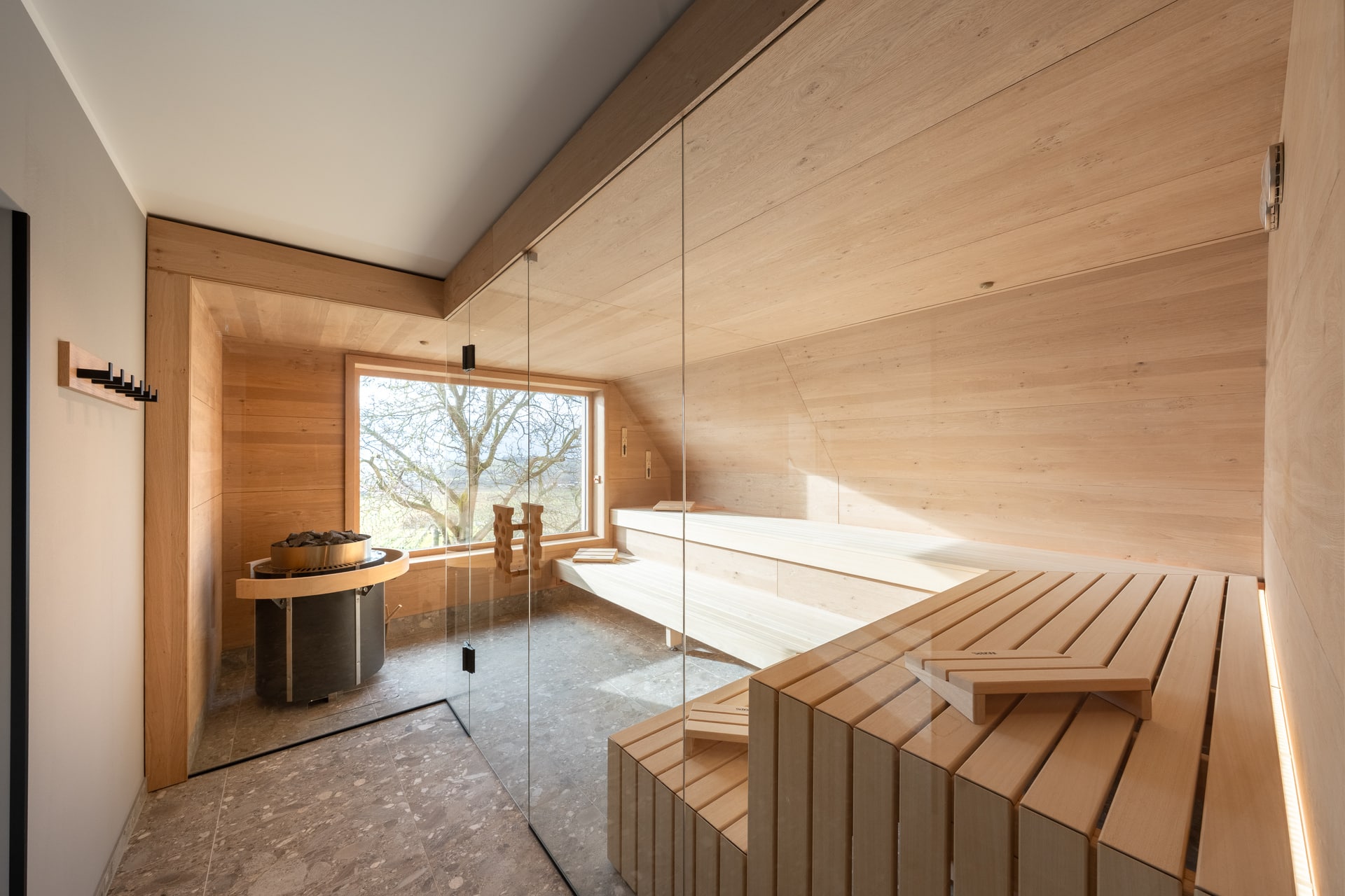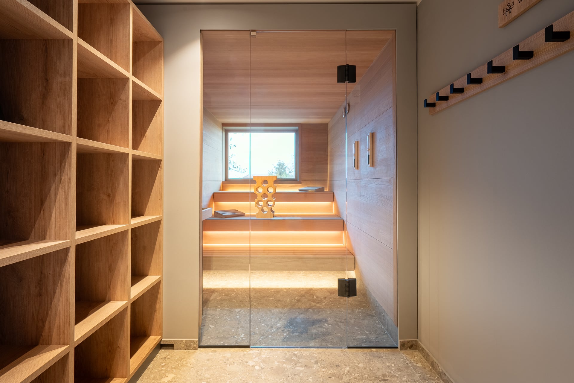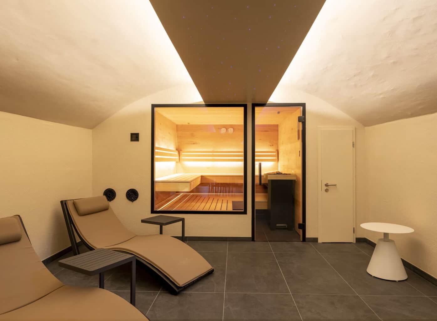 Im wunderschönen Elsass wurde das elegante Herrenhaus aufwändig umgebaut und mit einem Wellnessraum ausgestattet. Im Gewölbekeller des aus dem Jahre 1875 stammenden Hauses befindet sich der Saunabereich. Die finnische Sauna, eine Infrarotsitzbank sowie Dusch- und Ruhemöglichkeiten runden ein tolles Wellnessangebot ab. Großflächige Eicheplatten und eine indirekte Beleuchtung verleihen der Sauna eine außergewöhnliche Eleganz und lädt die Hotelgäste zum Entspannen und Verweilen ein.